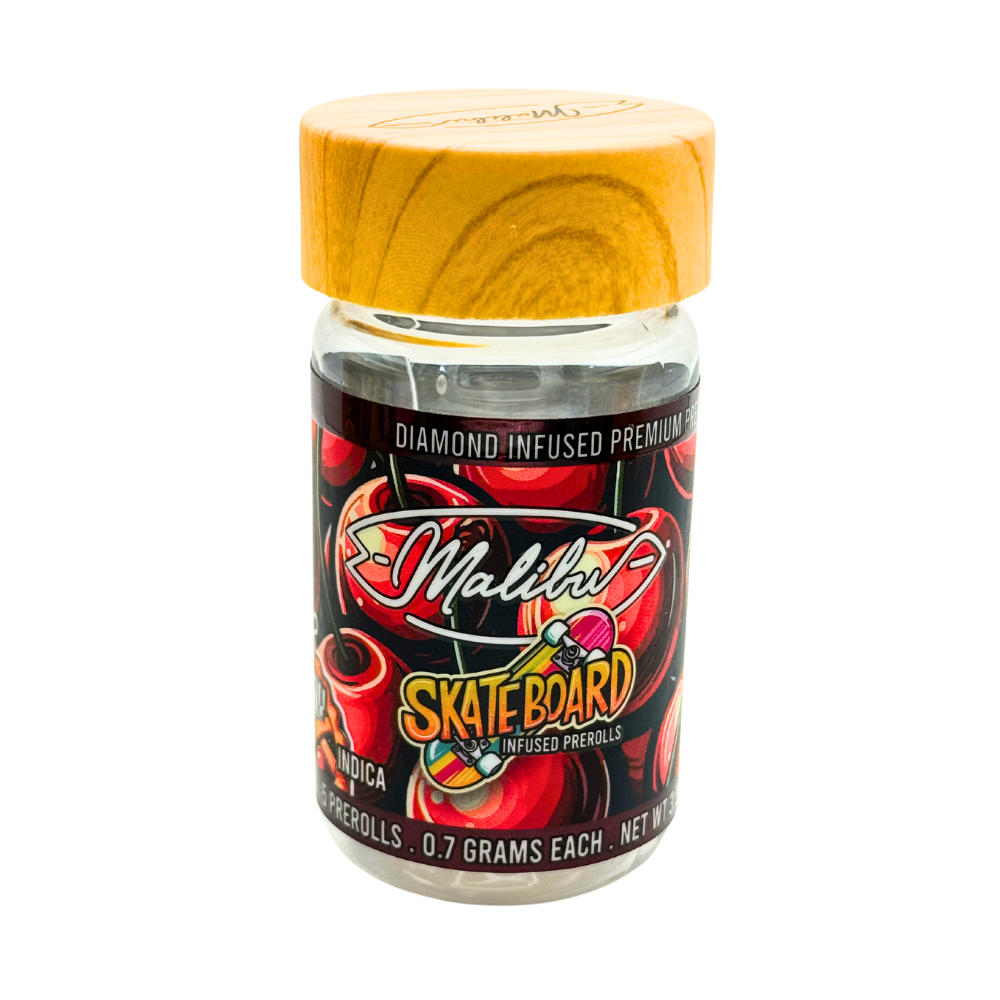 Malibu Skateboards 5-Pack Preroll in Cherry Pie Indica is a delightful treat, combining rich cherry notes with a calming, full-body high. Infused with potent diamonds and premium indica flower, each color-infused preroll offers a smooth, flavorful experience that’s perfect for winding down. The sweet, fruity aroma and relaxing effects of Cherry Pie make it an ideal choice for cozy evenings or moments of pure tranquility. Unwind with the sweet bliss of Malibu’s Cherry Pie prerolls.