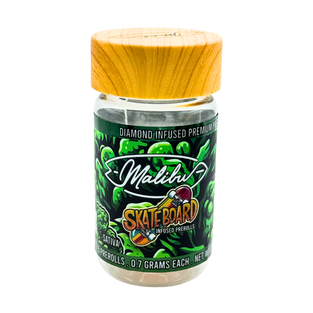 Malibu Skateboards 5-Pack Preroll in Green Crush Sativa offers an invigorating burst of energy with fresh, citrusy flavors. Crafted with premium sativa flower and infused with potent diamonds, these color-infused prerolls provide a smooth, uplifting smoke perfect for daytime use or sparking creativity. With its crisp, energizing profile, Green Crush delivers an exhilarating experience that’s both refreshing and potent. Get ready to fuel your day with Malibu’s Green Crush prerolls!